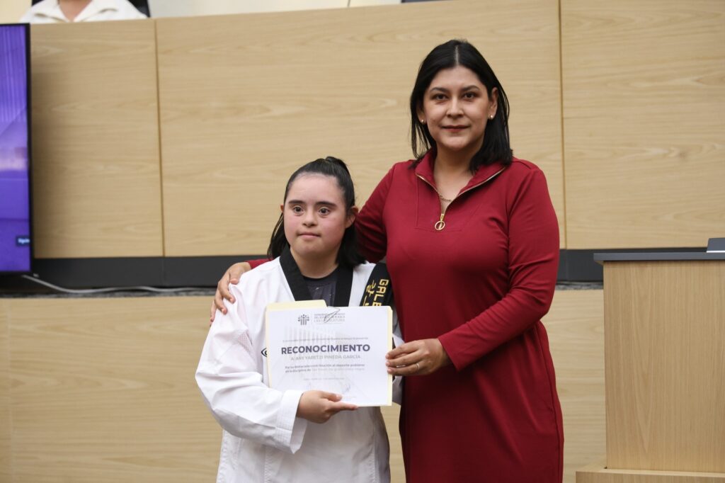 La diputada Ana Lilia Tepole Armenta encabezó la entrega de un reconocimiento a Any Yaretzi Pineda García por convertirse en la primera persona con síndrome de Down en obtener cinta negra en taekwondo, destacando su ejemplo de lucha, disciplina y perseverancia. 👏