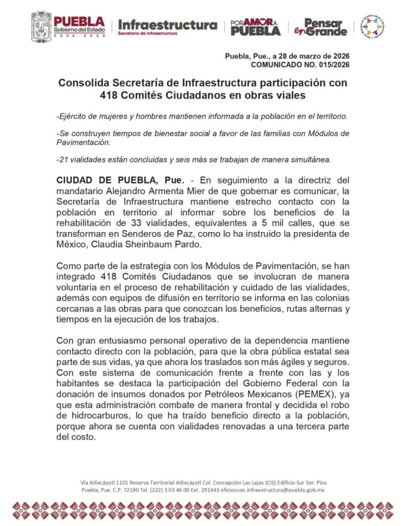 📢 Siguiendo la visión de que gobernar es comunicar, el Gobierno de Puebla mantiene contacto directo con la población durante la rehabilitación de 33 vialidades (más de 5 mil calles), convertidas en Senderos de Paz 🛣️🌿