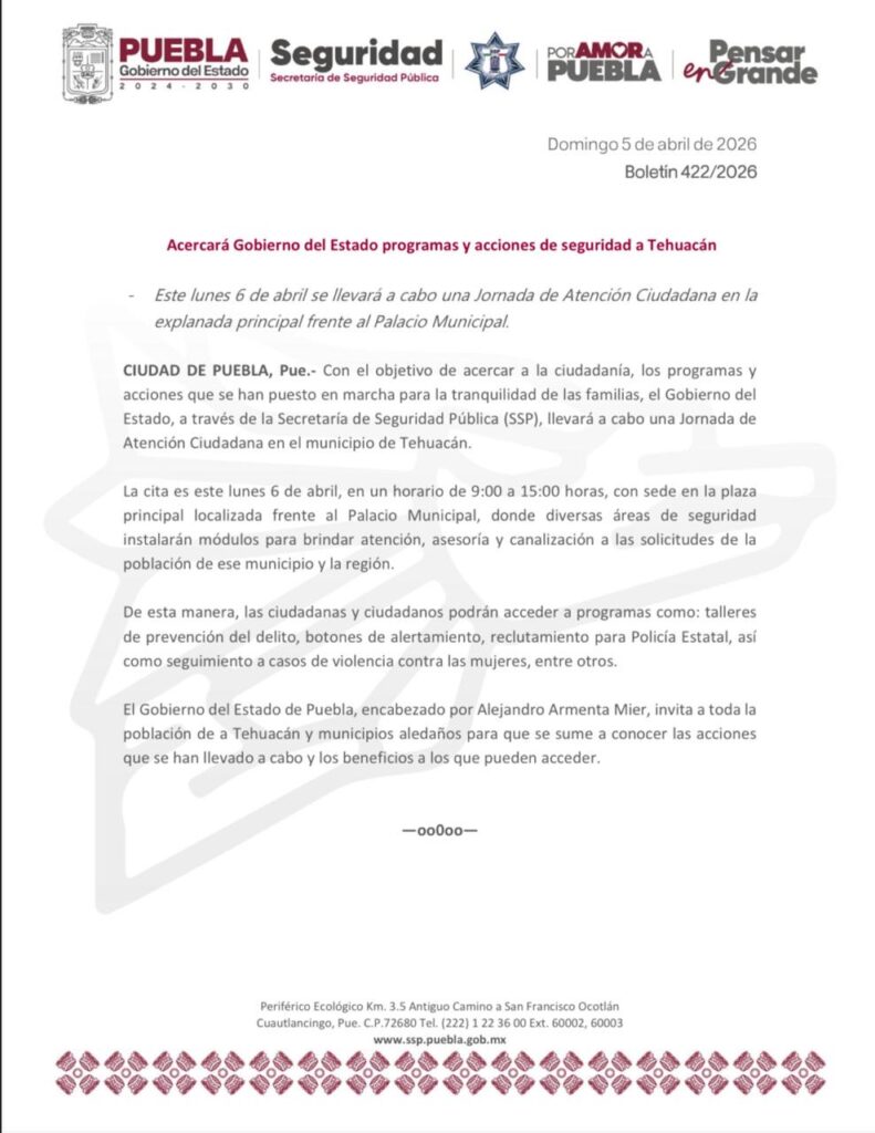 CIUDAD DE PUEBLA, Pue.- Con el objetivo de acercar programas y acciones de seguridad a la ciudadanía 🙌, el Gobierno del Estado, a través de la Secretaría de Seguridad Pública (SSP) 🚓, realizará una Jornada de Atención Ciudadana en Tehuacán 📍