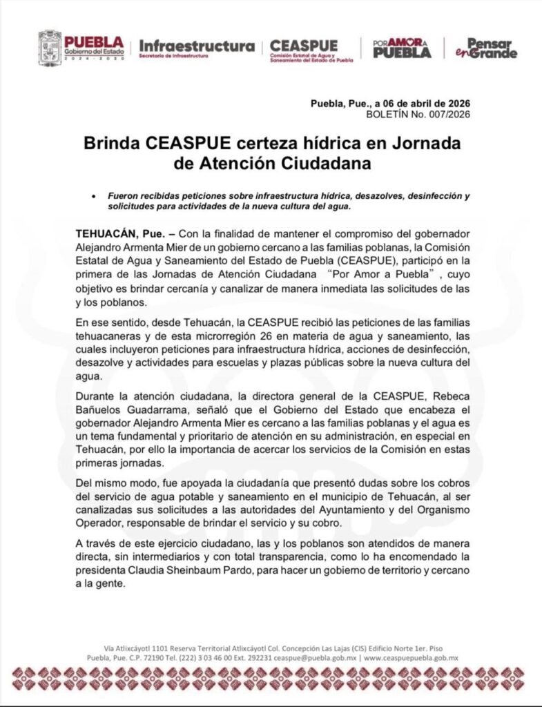 TEHUACÁN, Pue.- Con el objetivo de mantener el compromiso del gobernador Alejandro Armenta Mier de un gobierno cercano a las familias poblanas, la Comisión Estatal de Agua y Saneamiento del Estado de Puebla (CEASPUE) participó en la primera de las Jornadas de Atención Ciudadana “Por Amor a Puebla”, con la finalidad de brindar atención directa y canalizar de manera inmediata las solicitudes de las y los ciudadanos.