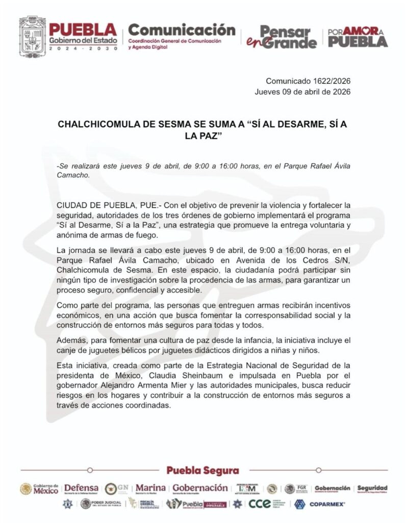 Este 9 de abril, el municipio se suma al programa “Sí al Desarme, Sí a la Paz” 🤝, promoviendo la entrega voluntaria y anónima de armas 💥 para prevenir la violencia y fortalecer la seguridad