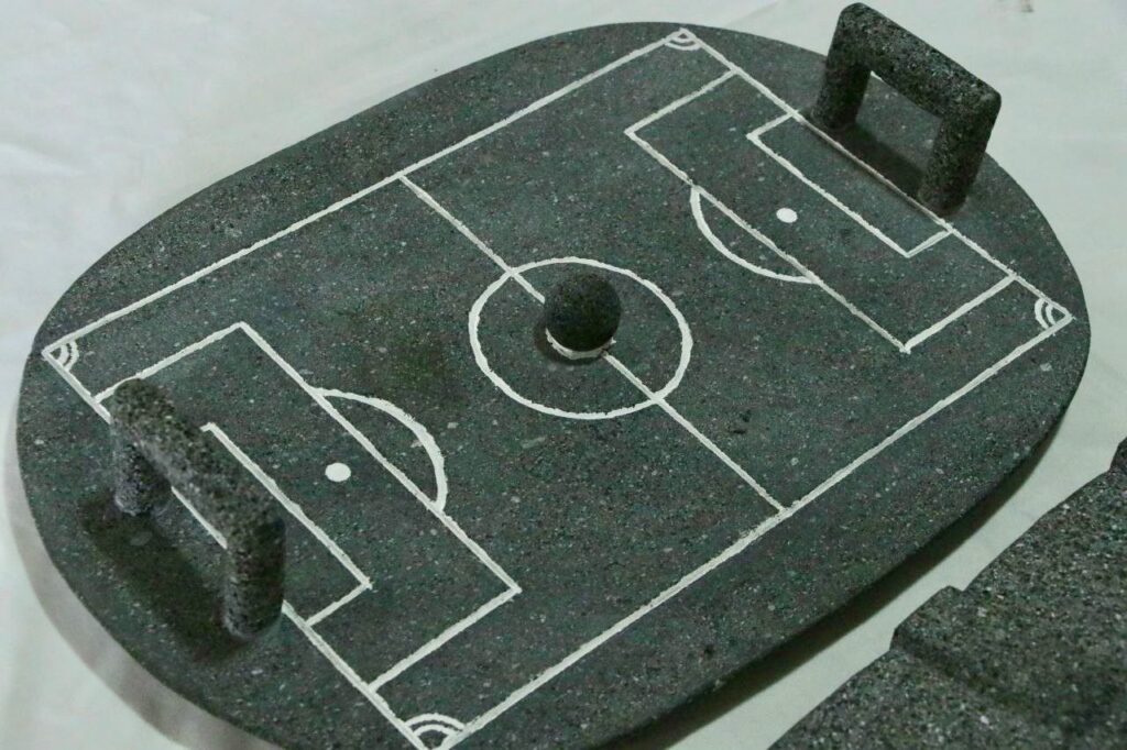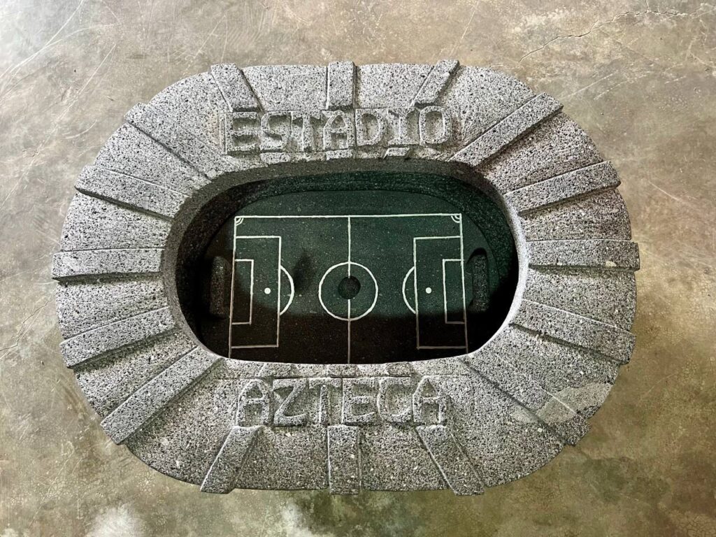 Entre las obras destacan un molcajete funcional de aproximadamente 100 kilogramos con forma del Estadio Azteca, elaborado por el maestro Juan Mena Ochoa, así como un comal de 12 kilos con diseño de jersey de la Selección Mexicana, creado por el maestro Cristian Mena Fernández 🇲🇽🔥
