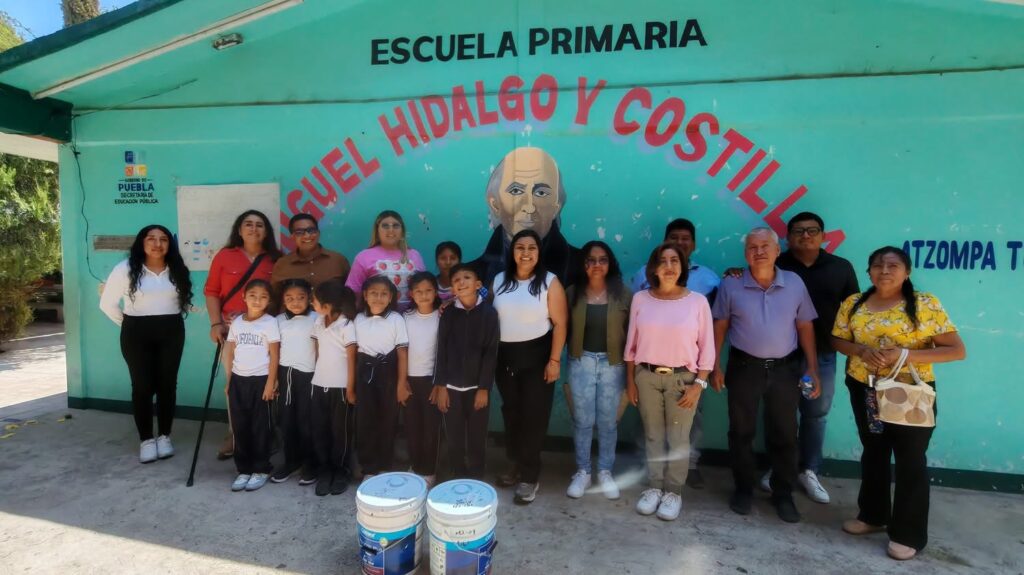 La presidenta municipal de Tulcingo del Valle, Maru Meza, junto con integrantes del Honorable Ayuntamiento y personal del DIF Municipal, realizó la entrega de cubetas de pintura en la escuela primaria “Miguel Hidalgo I. Costilla”, en la comunidad de Atzompa.