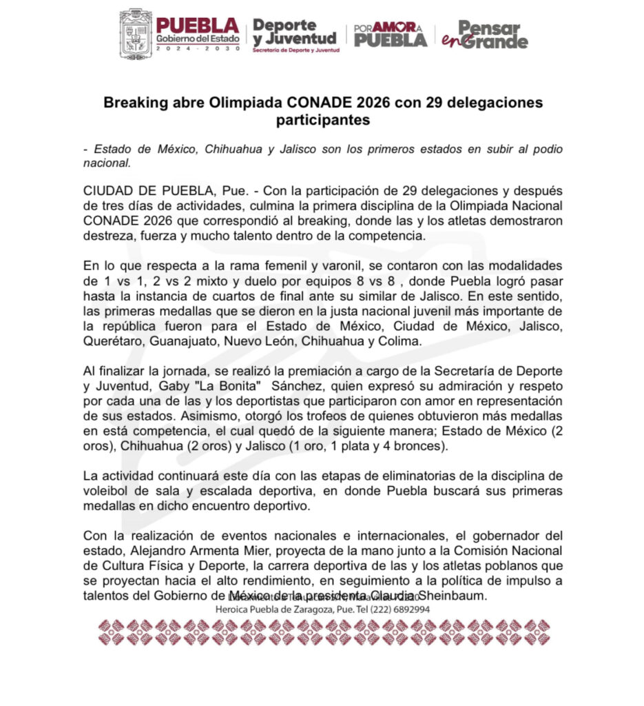 La actividad continúa con voleibol de sala y escalada deportiva, donde Puebla buscará seguir sumando medallas en esta justa nacional 🏐🧗♂️✨